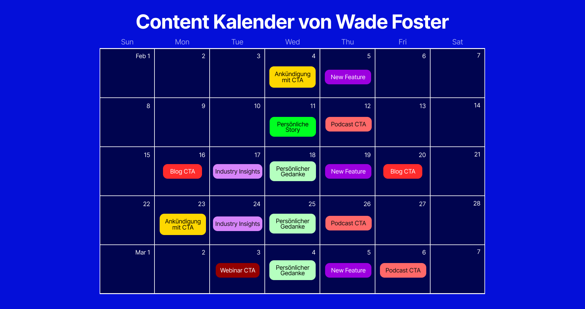 Ich habe mir jeden einzelnen Beitrag von Wade Foster seit Februar 2026 angeschaut und sie in einem Kalender kategorisiert.