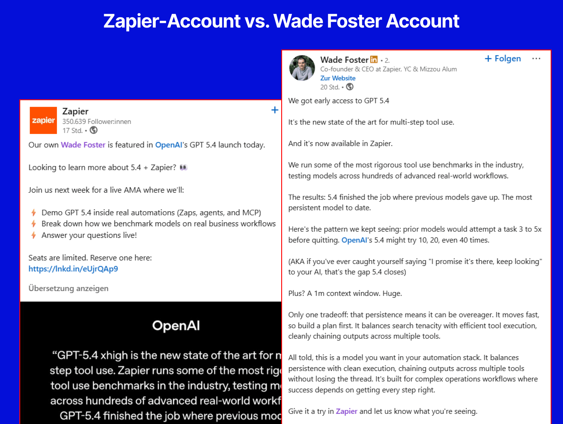 Jeden Mittwoch kommt ein Post, der nicht über Zapier-Features spricht, sondern über Wade Foster als Person, als Founder, als jemand der Learnings teilt. Seine Audience nehmen ihn nicht nur als Founder und CEO wahr, sondern auch als Thought Leader seiner Industrie.